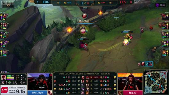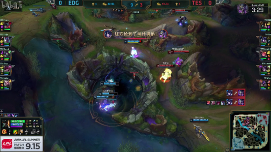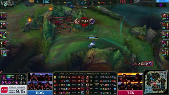 调整再来的TES从中路推进高地,击破高地的一瞬间就发起了团战先手,直接击杀EDG三人,但EDG的双C健在,求稳的TES选择了撤退。