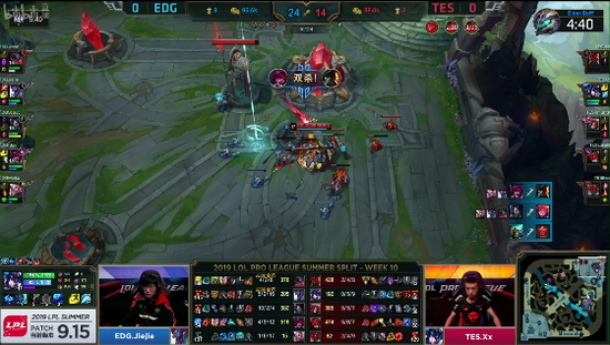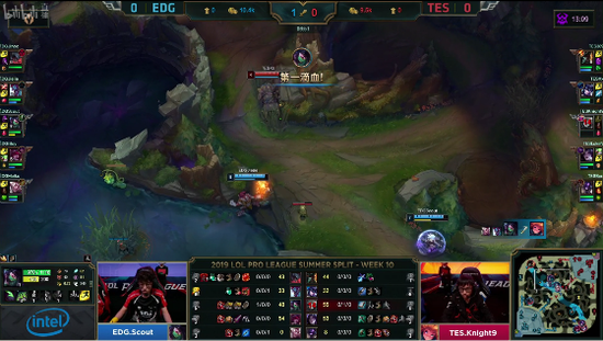 旗开得胜后EDG开始加快速度,频频在中上找到机会,TES陷入前期劣势之中,13分钟落后了3千经济。双方进入较长时间的僵持期,而EDG稳稳把持着自己的优势。