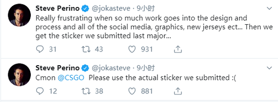 真的感到很沮丧。我们花了很多心血在这个设计上,而且在我们的社交媒体,图像和队服上都已经用上了,但最后我们得到的却是我们上一届Major提交的贴纸...