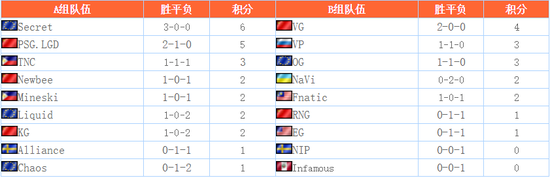 经过一天的比赛,秘密和VG分别占据A、B两组积分表首位,出线形势较好。A组Chaos、A队和B组Nip、Infamous分别小组垫底。