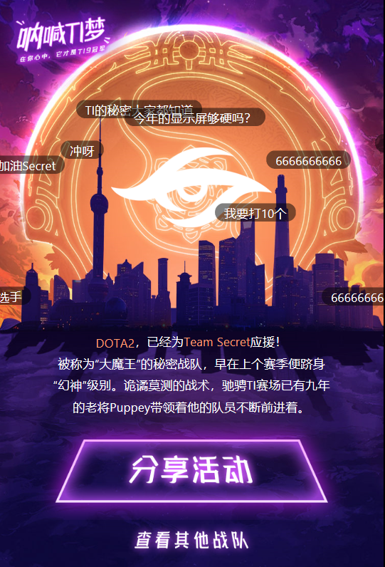 点击“分享活动”,即可告诉其他人你喜爱的战队是哪支!为支持的战队加油助威,在你心中,TA就是TI9冠军!
