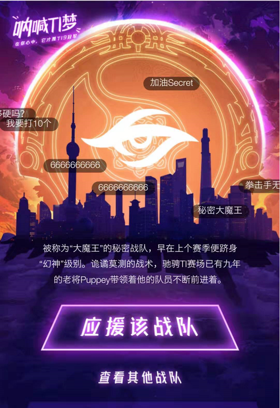 点击“查看该战队详情”,即可了解战队本赛季信息、历史过往和TI9上的前景,之后即可选择“应援该战队”,将你支持的战队分享至各社交渠道!(以Team Secret战队为例)