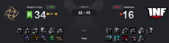 18分钟,INF四人推进NIP的下路高地,上路蜘蛛依旧在带线,NIP分身无暇没有一点办法。20分钟,INF蜘蛛带队打盾,剑圣控盾准备一波了结掉NIP。之后蜘蛛10秒BKB无解金身咬人入泉,NIP绝望打出GG。