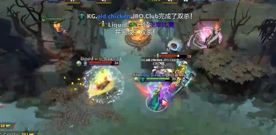 十五分钟KG三座外塔全部丢掉,KG二塔换了液体一塔,液体继续推进,KG没人回防,下路高地塔被打残。十九分钟奇迹哥跳PA脸杀人,赶来支援的冰魂也被留,奇迹哥拿到双杀。液体阵容太灵活,KG有点难打了。