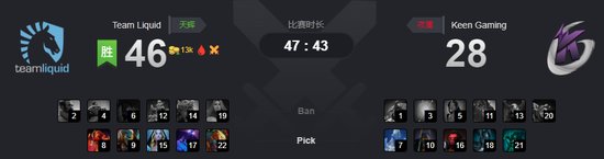 液体一拿火猫,再拿大牛、冰女、谜团,KG选出冰魂、小Y、斧王、PA、黑鸟,液体最后补出一手TK,不走寻常路。