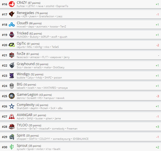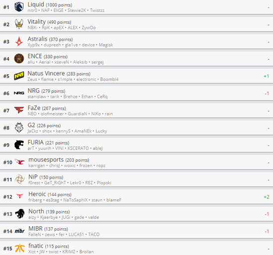 而在12-30名,变动则比较频繁。Heroic战队排名进一步上升来到第12名,而North和MIBR则各自下滑一个席位。
