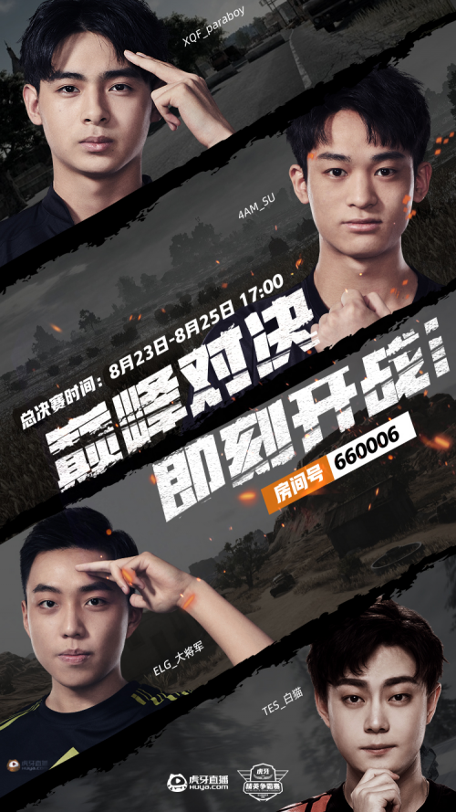 2019年8月23日,虎牙直播主办的《和平精英》精英争霸赛即将迎来线下总决赛的巅峰对决。在经历线上赛阶段的预选赛、定位赛、循环淘汰赛和半决赛重重筛选后,25支代表国内最高水准的战队脱颖而出。他们将在上海U+时尚艺术中心进行为期三天的线下比赛,争夺最终冠军及高额奖金。老牌劲旅TES、XQF和ELG领衔出战,后起之秀4AM、JS和GK强势出征,巅峰大战一触即发,究竟谁能问鼎冠军宝座?
