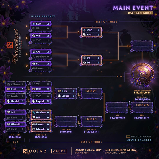 明天是TI9的第七个比赛日,即淘汰赛的第三天。胜者组的两个BO3,分别是LGD和VG的内战,以及EG和OG的外战。从第一轮的表现看,LGD的状态似乎比VG强了不少。虽然在采访中两队的选手都称自己是另一个队的粉丝,但是在赛场上碰面的时候,相信LGD和VG能为我们带来精彩的比赛。另一边,OG在实力上领先EG一个档次。如果不出意外的话,大爹会重现他与Fly的握手时刻。不过,RTZ的状态回暖似乎会给比赛平添几分乐趣。败者组那边,NB的对手是战胜了KG的INF,而秘密则会与Mski碰面。随着留下的队伍越来越少,比赛即将进入白热化的阶段。究竟谁能捧得冠军神盾?让我们拭目以待!