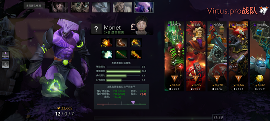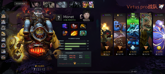 相对于炼金,莫奈特的虚空给人的印象更为深刻。从21分钟用“替身攻击”敲死飞机开始,比赛就变成了莫奈特的个人秀。那一次,尽管虚空被动的连续触发和运气有关,但莫奈特只身一人闯入敌阵,本身就是勇气的证明!还是那波圣坛团战,残血虚空在回到安全位置后没有抛弃队友——在Flyby被VP集火的情况下,莫奈特直接反打!混乱中,VP低估了虚空的输出,让处于极限血量的莫奈特放出了时空漫游。虽然未能拯救队友的性命,但莫奈特也换掉了VP的两名英雄。顶住对面的最强一波后,莫奈特的经济到达全场第一。金箍棒、大雷锤、不朽盾,神装虚空在VP的高地上无限超神!看到这一幕,我们必须审视RNG在赛前定下的目标。今天,他们杀入了前八,再赢一把就是前六。如果莫奈特能继续发威,一切皆有可能。