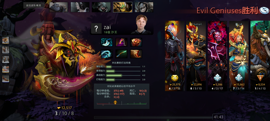 赛前,当其他队伍都在调设备、练英雄的时候,我们的“DOTA上帝”却在忙着修改嘲讽轮盘。或许有人会将这样的行为视作对比赛的不尊重,但没过多久,OG就用实力证明,他们的确是高人一等的存在。打NB的两局比赛,OG赢的极为轻松。比赛过程中,NB能做的顶多就是在前中期“朝天上丢丢斧头”。而余下的所有时间,都是OG的单方面虐杀。