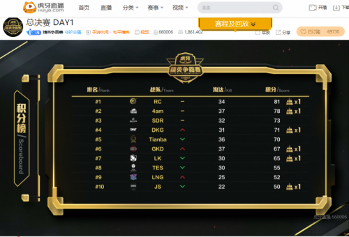 8月23日,虎牙精英争霸赛线下总决赛首日正式开战。由于赛程三天,首日比赛大部分战队选择相互试探,战术打法相对保守。年轻的4AM则全员莽夫大杀四方,豪取全场最高37淘汰的同时勇夺积分第二。受瞩目的豪强TES、XQF和ELG明显还在慢热段,发挥中规中矩的他们暂列积分中段。而钢枪猛男JS虽然首局十三杀吃鸡技惊四座,但后续接连反向的最终仅位列积分第十。