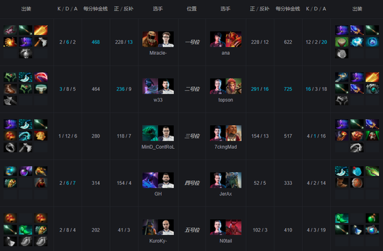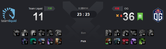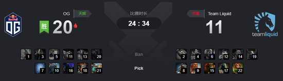 OG战队拿出了一手推进和后期兼备的阵容,幽鬼小小双核,搭配小鹿骨法大牛。而Liquid则是大哥TA中单米波,三四五分别是潮汐拉比克老陈。