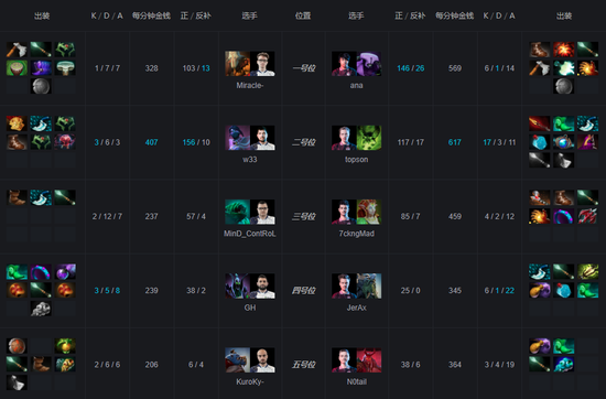OG起手点出大哥小精灵,搭配中单飞机三号位伐木机。而Liquid这边意外地拿出了大哥钢背,然后是w33的绝活风行。