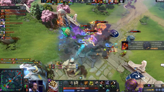 22分钟OG顺利控盾,再杀一次潮汐,MC的潮汐已经血崩了,经济排在倒数第三。一分钟后,小狗在下路被逼出魔免TP,结果OG马上转移到中路,强杀了小狗,然后又转移到上路杀掉了带线的TA,经济差距已经达到了10K。