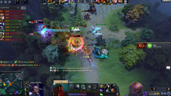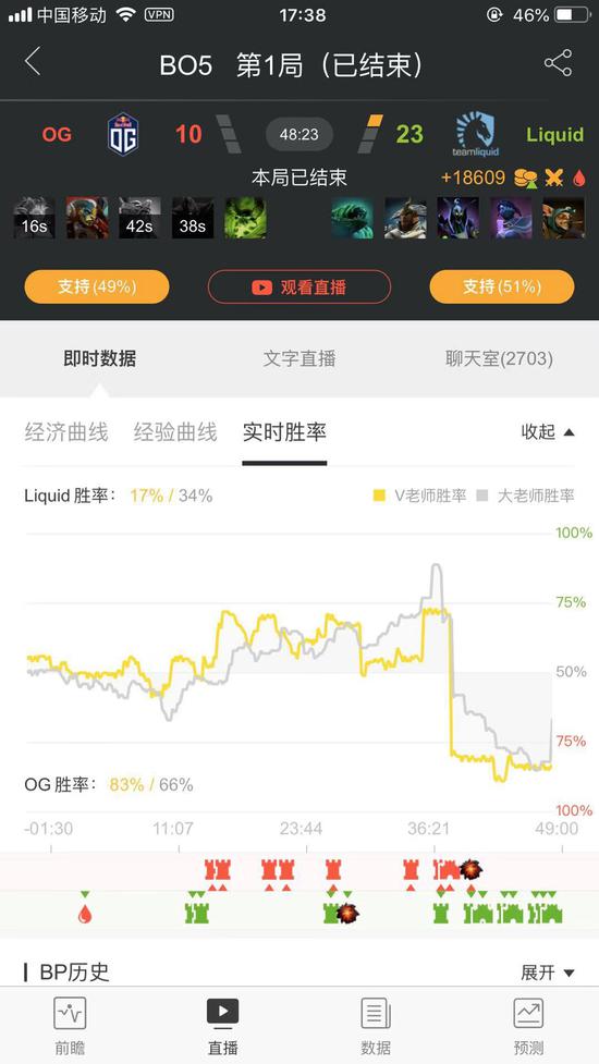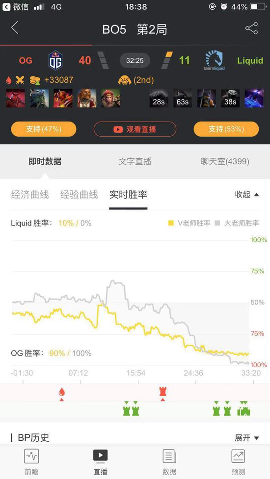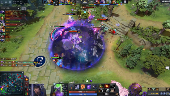 OG依然拿到了他们擅长的奶推体系,而Liquid的阵容依然要看TA的节奏,然后线上Liquid就被打爆了,滚起雪球的OG简直乱杀,而V老师从开局就给了OG阵容较高的胜率,之后也始终坚定不移地支持OG。