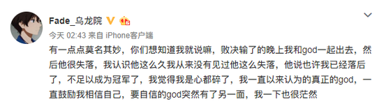 Fade在今天凌晨发了一条微博,向我们揭露了在败者组决赛输给Liquid之后,Fy的心路历程。