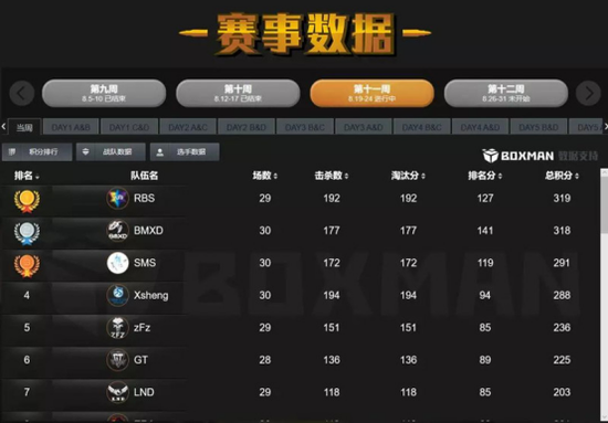 PWL勇士联赛第十一周收官!RBS以319积分夺下第十一周冠军,获得了2000元奖金,BMXD与RBS一分相差排名第二,获得了1000元奖金,第三名是SMS,获得了500元奖金,第四名Xsheng,第五名zFz。血手幽灵作为赛事唯一指定键鼠品牌,共同见证周冠军诞生!