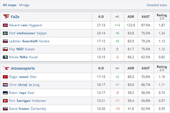 换边后同样A区快攻的FaZe Clan也倒在了woxic枪下,夜王NiKo开局至今也仅有6个击杀可谓手感全无。但关键的关键,还是雨神Rain第17局的击杀与拉扯再次摁住了对手翻盘的势头。今天Mouz两员小将同样哑火,ropz与frozen的击杀甚至低于指挥karrigan。最终,FaZe Clan成功以16-8的比分击败对手,拿下首胜。