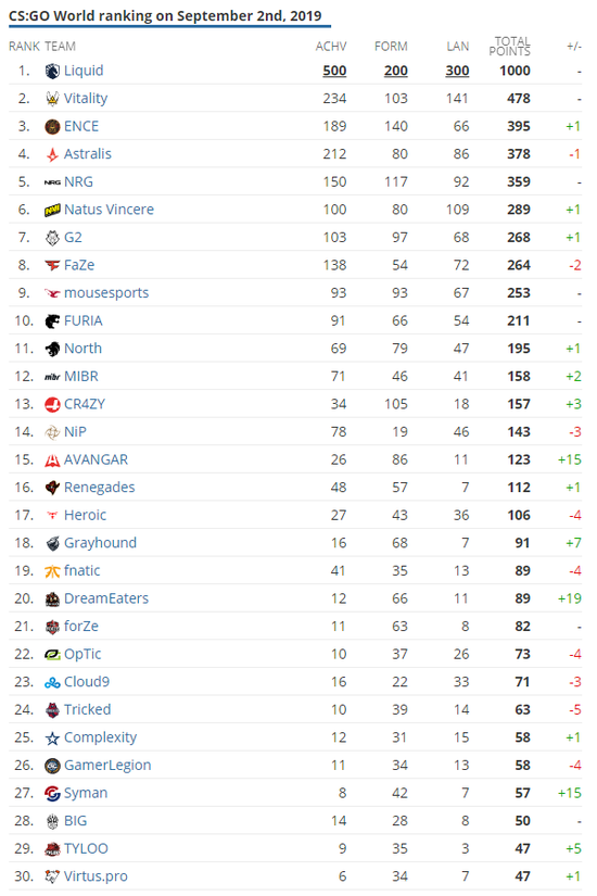 随着2019柏林Major前两个阶段的比赛结束,HLTV更新了最新一期的战队积分排名榜。本月的榜单中,前几名队伍增长下降幅度并不是很大。Liquid依旧高居榜首,第二到五名分别是Vitality、ENCE、Astralis和NRG。FaZe Clan在经历惨败后已经跌至第8名,而NIP已经掉至15。其实变化最大的队伍还属独联体地区,曾经默默无闻的AVANGAR、DreamEaters和Syman三支队伍纷纷杀入前三十,有着显著的提升。