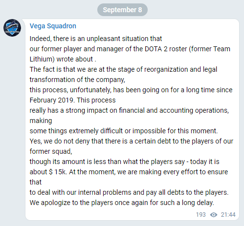 没错,我们不会否认我们拖欠了选手的钱,不过这笔钱的数量比选手们说的要少,大概是1.5万美元。而现在我们正在尽一切可能确保解决我们内部的问题,然后向选手们付清欠款。再次向被我们拖欠了这么久钱的选手表示歉意。
