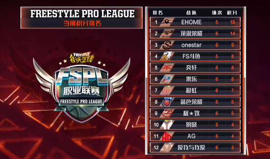FSPL第二周战罢,EHOME战队5战全胜积15分排名第一,顶级荣耀积14分,但是他们比EHOME战队多赛一轮,Onestar积9分排名第三,斗鱼、果乐以及炎轩战队8分紧随其后,爱我与我爱仅积3分暂时垫底。