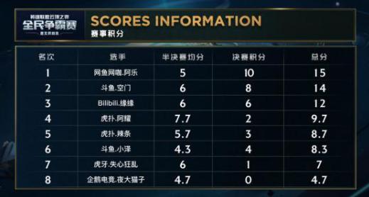 云顶之弈全民争霸赛是云顶之弈上线后官方举办的首个云顶之弈赛事,各路高手踊跃参加。成功晋级决赛的共有8名顶尖选手,最终网鱼网咖阿乐拿下了"云顶之弈全民争霸赛"的冠军,而备受大家看好的空门获得亚军,与第一名仅差一分之遥。