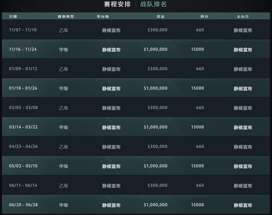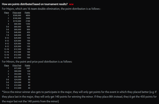 新赛季将保持5个Major和5个Minor的规模,Minor与Major配套举办,Major总奖金为100万美元,Minor总奖金为30万美元,这些都与上个赛季保持一致。不过在DPC积分上有所改变,新赛季Major依然会提供15000点DPC积分,而Minor的积分则从500点上涨到了660点。