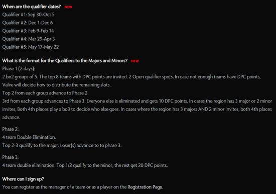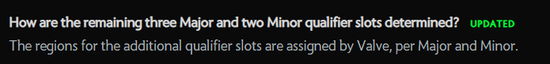 与上赛季一致,Major名额每个赛区保底2个,Minor名额每个赛区保底1个,Minor冠军可以获得Major参赛资格。而剩余的3个Major参赛名额和2个Minor参赛名额将由V社指定分配。