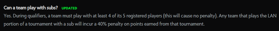 可以。在预选赛阶段,队伍正式名单上至少有4名队员参赛(这不会有惩罚)。进入线下阶段后,带替补的队伍从比赛中获得积分会被扣除40%作为惩罚。