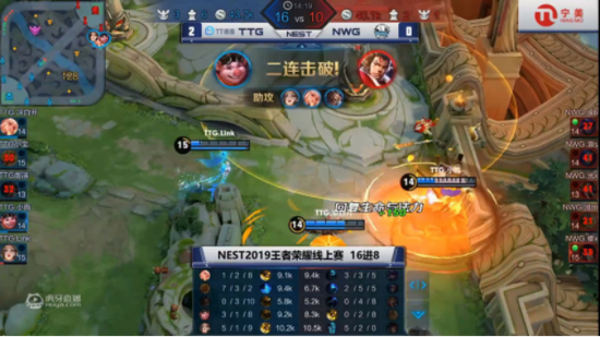 9月16日,虎牙NEST王者荣耀十六强继续开战。首场TTG迎战NWG,虽然NWC每局都在前期形成对抗,但实力更强的TTG不断蚕食资源扩大领先,中期一波团战直接取胜,最终TTG三比零击败NWG挺进八强。次战TYN迎战GF,十六强实力最接近的比赛激烈上演,GF凭借决胜局边射大枪的完美发挥艰难三比二战胜对手锁定八强。