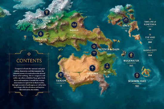 这本百科全书涵括了符文之地截止目前的全部11个区域,包括德玛西亚、诺克萨斯、艾欧尼亚、比尔吉沃特、弗雷尔卓德、班德尔城、巨神峰、皮尔特沃夫、暗影岛、恕瑞玛、祖安,记载了英雄联盟宇宙中世界各地的英雄、动植物、建筑,不同阵营的政治、文化、科技等诸多方面的内容。此外书中的数百幅插图涵盖了没有公开过的全新的符文大陆地图和各式各样的艺术品。