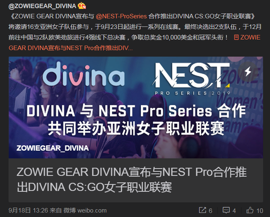 近两年来,国内的女子职业赛事项目越来越受重视。ZOWIE GEAR DIVINA宣布与NEST Pro Series 合作,推出DIVINA CS:GO女子职业联赛,共同推动女子电竞,提供认真致力于电竞的女性玩家,有发挥实力的舞台。