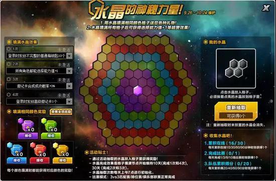 通过活动获得的水晶放入格子里获得奖励。填满水晶获得的效果是格子填满节点开始维持十天(一次和四次奖励)和三十天(二次和三次奖励)。水晶抽取次数每日上午7点初始化。