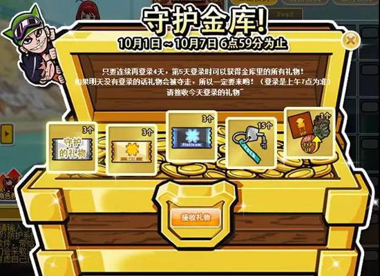 只要连续登录4天,第5天登陆时可以获得金库里的所有礼物。如果次日没有登录,礼物会被夺走,所以请一定要来哟。(登录以每日上午7点为准)