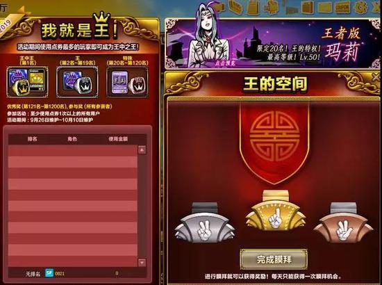 活动期间使用点券最多的玩家成为王中之王!活动期间使用点券至少1次以上。代金券消费不计算在本活动中。本次赠送礼物给他人的消费不计入我是王活动。