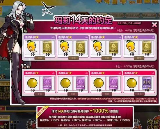 每天完成一场:+100%经验值,完成两场:+200%经验......完成10场:+1000%