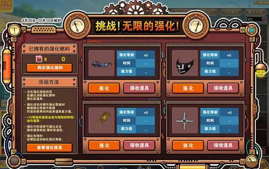 点击强化按钮,会通过消耗燃料强化该道具,不同强化等级消耗染料不同。强化成功提升强化等级时,根据强化等级可以获得对应的使用时间或者道具能力值。强化中的道具可以通过点击“接收道具”按钮接收该道具。(等级0的道具无法接收)强化失败时会降低或者初始化强化等级。(初始化时即强化等级归0)接收后的道具在账号转送中选择能力值。