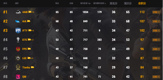季后赛第二日战果已出,在常规赛中获得第一名的IFTY和第二名的QM表现强势各胜一局,分别位列单日积分的第二、三名。而在常规赛表现平平的Ark战队则后来者居上获得了单日积分的第一名。目前,季后赛的总积分排行榜上,4AM战队暂时位列第一位,Ark战队和IFTY战队紧随其后位列二三名,三者之间的积分差距很小,竞争十分激烈。