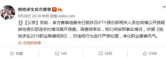 “目前,官方赛事组委会已就昨日iFTY俱乐部相关人员在微博公开质疑其他俱乐部选手的情况展开调查。调查结束后,我们将按照事实情况,依据《绝地求生2019职业联赛规则》,对违规行为进行严肃处理,净化职业赛事风气。”