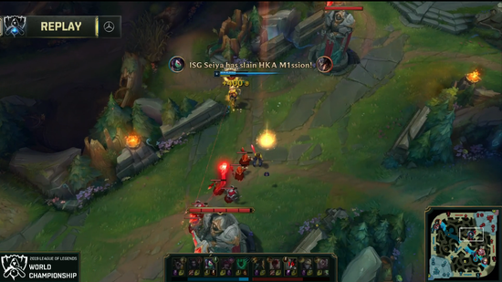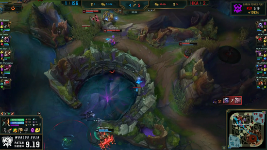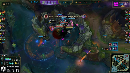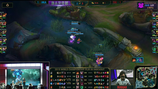 21分半,HKA看到杰斯在下路,直接五人Rush大龙,ISG抢龙失败,还被HKA击杀三人。25分钟,双方在ISG中路高地打出1换1,但HKA推掉凭借大龙Buff破掉ISG三路高地,将经济差拉到14K!