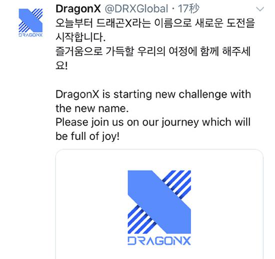 DragonX战队官宣:“今天开始将以DragonX的名字开始新的挑战。一起踏上我们充满快乐的旅程吧!”同时公布了DragonX的全新战队LOGO,移除原本KZ队标“X”中的龙首,改为线条状蓝色“X”形LOGO,整体画风更为简洁大气。