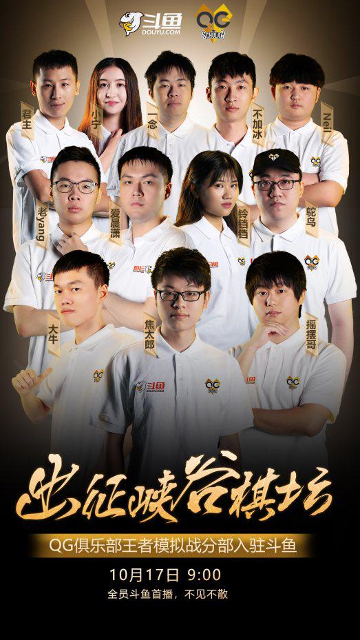 王者荣耀职业联赛豪门QG战队模拟战分部已宣布10月17日上午9:00正式入驻斗鱼,将全面发力王者模拟战职业赛道。