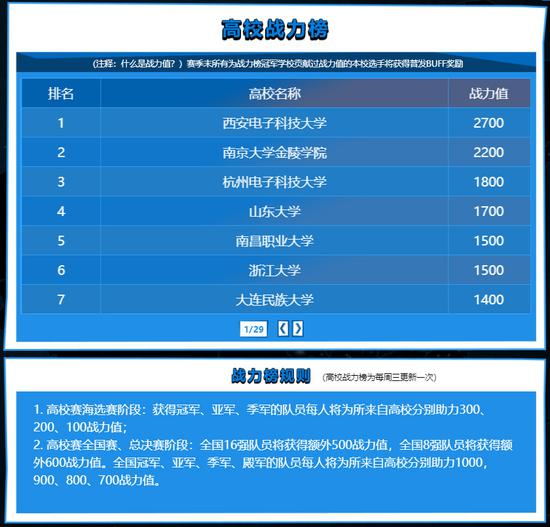 高校战力值,不仅代表着高校的竞技水平,更体现了每个学校的电竞氛围。全员出征,在高校赛场上留下你和同学最热血的记忆,有什么比这更令人羡慕的呢?赛季末,所有为战力榜冠军学校贡献过战力值的本校选手将获得普发BUFF奖励哦,快来高校赛为你的母校添砖加瓦吧!