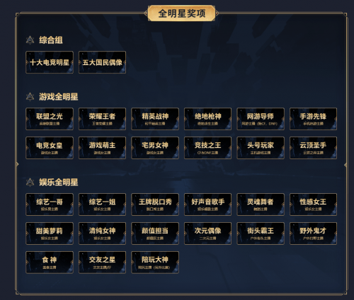 年度全明星将分为游戏赛区和娱乐赛区,赛制按时间分为N进24——24进12——12进6,随后是更为激烈的复活赛,最后才是全民关注的决赛。奖项如此之多,赛程又十分紧凑,各大主播间的比拼只会愈演愈烈,想必参与其中的观众会看到一场前所未有的狂欢盛宴。