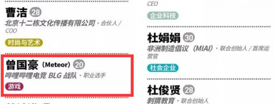 在游戏领域中,更是有不少知名选手、解说及主播入选。而哔哩哔哩电竞自诞生以来,就投身于各项电竞热门项目,并且取得了不错的成绩,培养出一批优秀选手。此次福布斯中国U30榜单,共有两位来自哔哩哔哩电竞的选手上榜,分别是BLG《英雄联盟》分部曾国豪(Meteor)和杭州闪电队徐秋林(Guxue)。