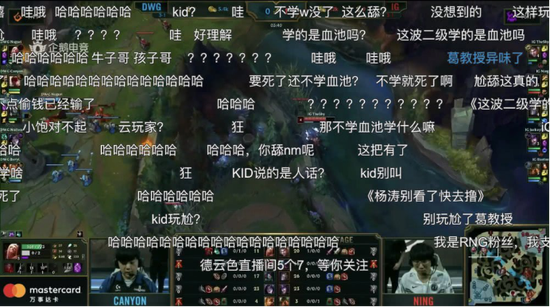 DWG上路烂掉,开始从下路打开局面,打野去到下路击杀小宝,德云色也开始了,“又欺负小宝,就会抓小宝。”而前期TheShy7分钟1200经济并且打出对位单杀,德云色依然不忘小宝的功劳,“果然是你TheShy”,“还是小宝立功”,“小宝立大功”。