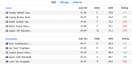 图二来到Inferno,延续图一手感先做进攻方的牛仔再度以5-1开局,不过随后fnatic老将们连续的出色残局处理在上半场很快扭转局势,但来到进攻方fnatic的便秘进攻根本不是擅长枪法对决牛仔的对手,下半场fnatic进攻了了,几乎很难对牛仔的防线产生威胁,最终Renegades以16-13的比分成功逆转取胜。