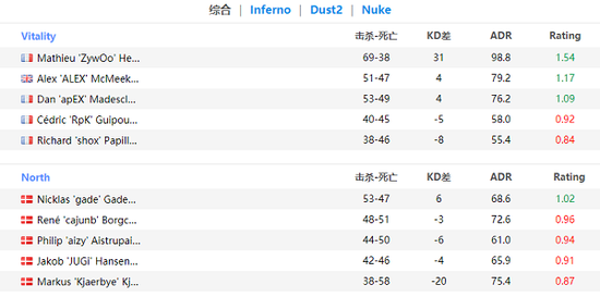 图二的Dust2,North顺利4-0开局过后法国人开始发力,shox与apEX本场难得的发挥帮助ZywOo顺利度过白给难关,而cajunb的沙鹰连续爆头ECO翻盘让North再度掌握场上优势,上半场North依然8-7领先。来到CT这次的North不再梦游,自法国人拿下手枪局后在整体配合上North也远比Vitality表现出色,小蜜蜂艰难拿下的两分也只是Rpk与ZywOo的个人偶尔闪光,图二North以16-12将比赛拖入图三。决胜图的Nuke几乎完全成为Vitality的个人秀,North拿下手枪局3-0开局过后便再无招架之力,ZywOo的全场游走各点偷人,迷离两场的shox也逐渐苏醒,上半场做进攻方的Vitality便拿下10分之多,而下半场法国人抢下手枪局后基本已大局已定,最终Vitality以2-1的大比分击败North顺利挺进胜者组决赛。