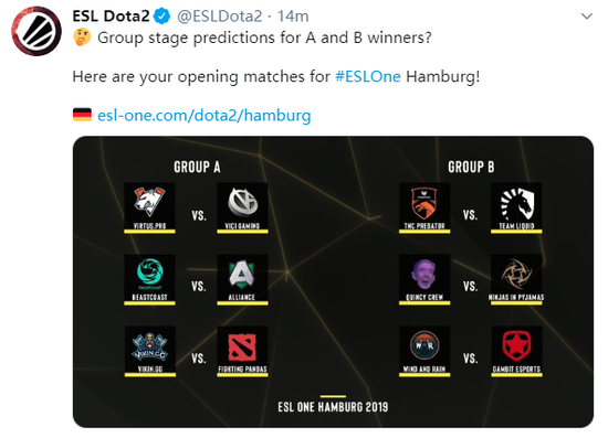 ESL One汉堡站小组赛将正式开启,主办方ESL也在刚才公布了小组赛的分组情况。