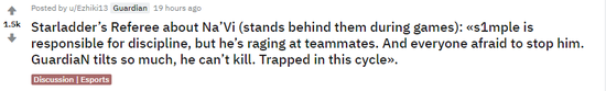 赛后更是有网友在Reddit上爆料GuardiaN的发挥是受到了s1mple心态爆炸的影响。这张截图来源于Reddit,一名用户发帖爆出了StarLadder裁判的消息记录并概括了事情原委,内容大概是这名裁判整场比赛都在NaVi身后,亲眼目睹了s1mple在比赛中心态爆炸,朝着队友发脾气,严重影响了队伍的表现。